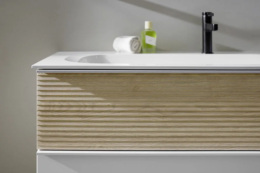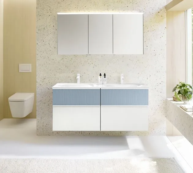 Die Badmöbelserien Fiumo und Fiumo 2.0 von burgbad stehen für klare Formen, wandelbares Design und anwenderfreundliche Konzepte. Während Fiumo durch optional strukturierte Plissee-Fronten überzeugt, setzt Fiumo 2.0 mit seiner vertikalen Rillenstruktur neue gestalterische Akzente. Beide Serien sind auf filigrane Mineralguss-Waschtische abgestimmt, bieten Stauraum in vielen Varianten und lassen sich durch Farben, Dekore und ergonomische Griffe individuell anpassen.