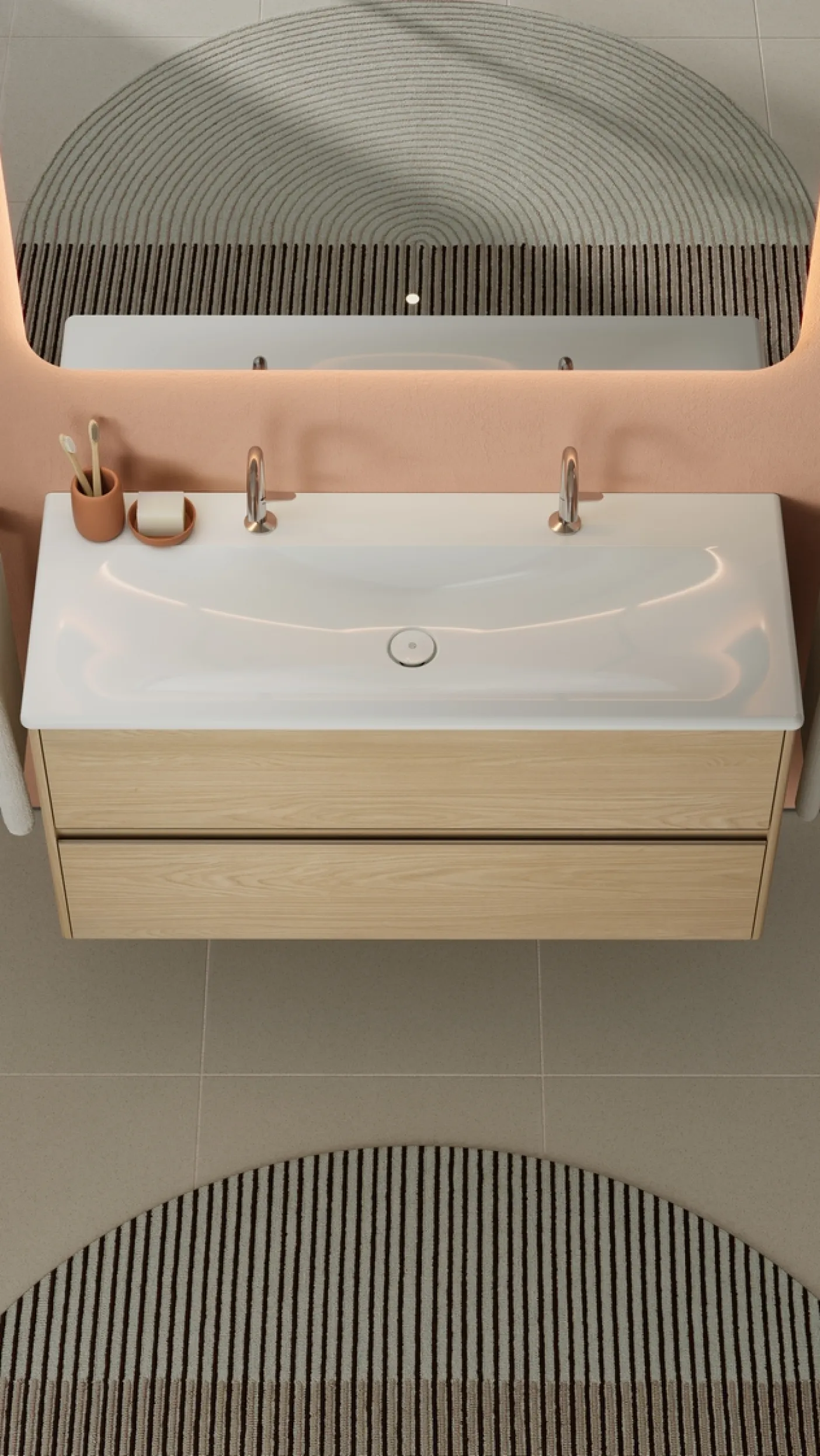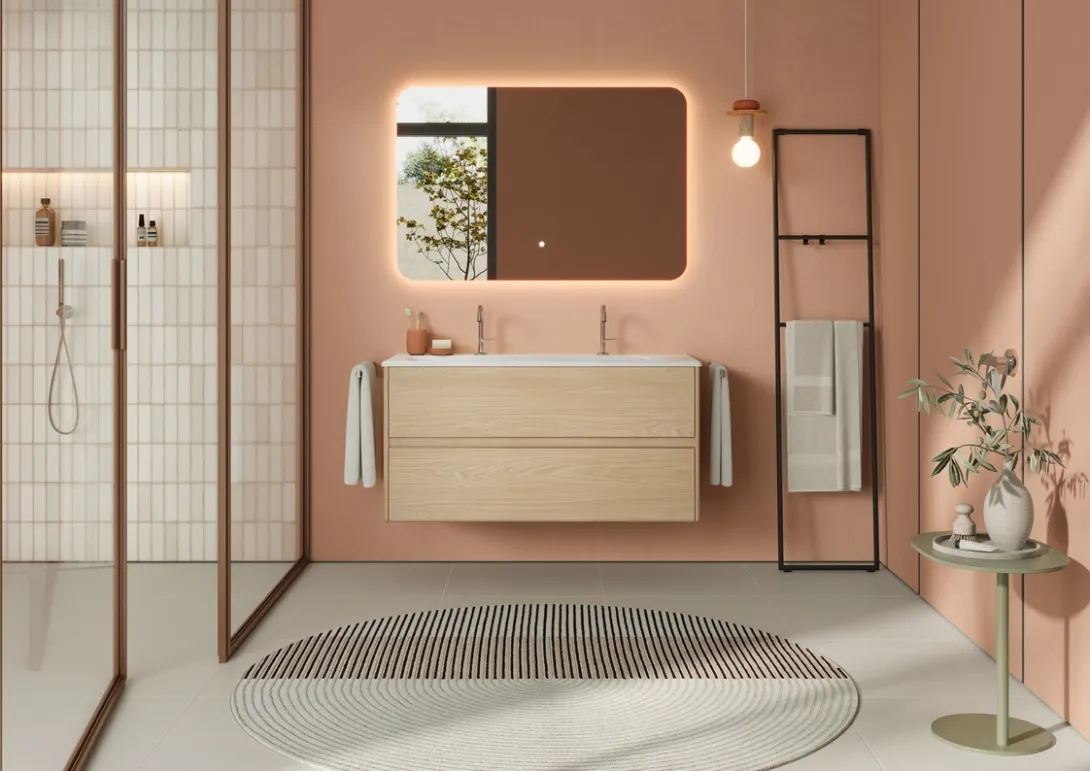 Oteo wurde gezielt auch für kleinere Räume entwickelt und entfaltet gerade dort seine Wirkung. Die Serie bietet eine durchdachte Lösung für kompakte Badezimmer und kombiniert platzsparende Planung mit einem auffälligen Designcharakter.